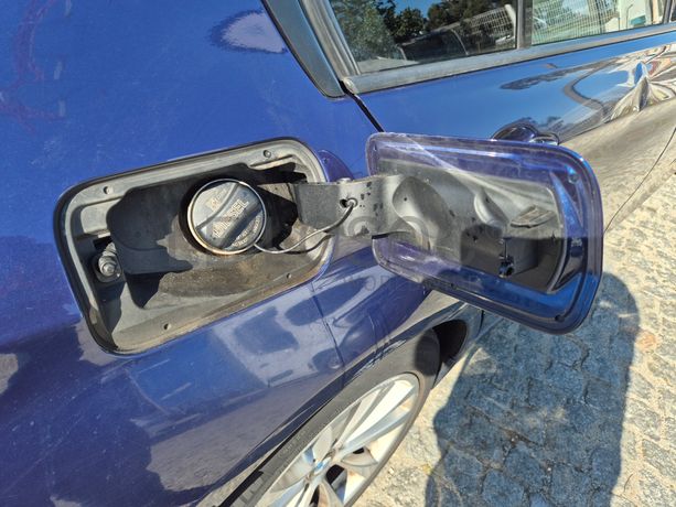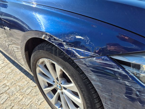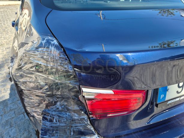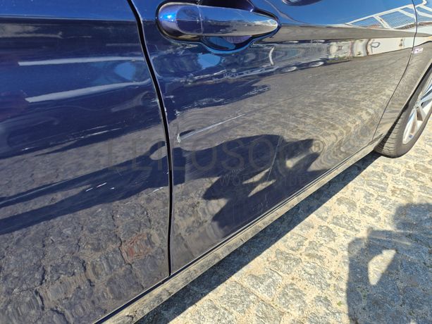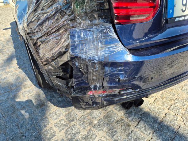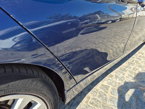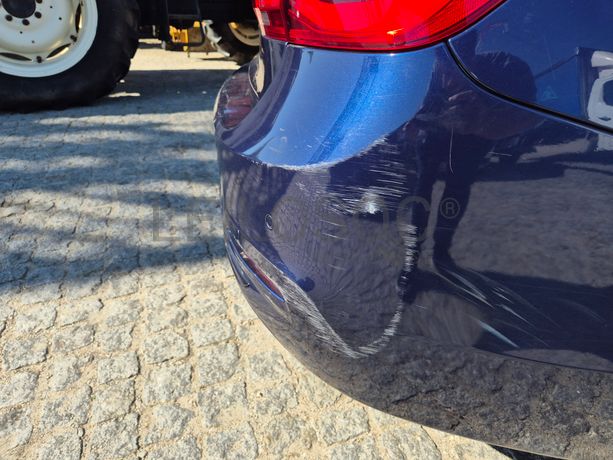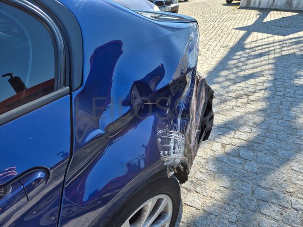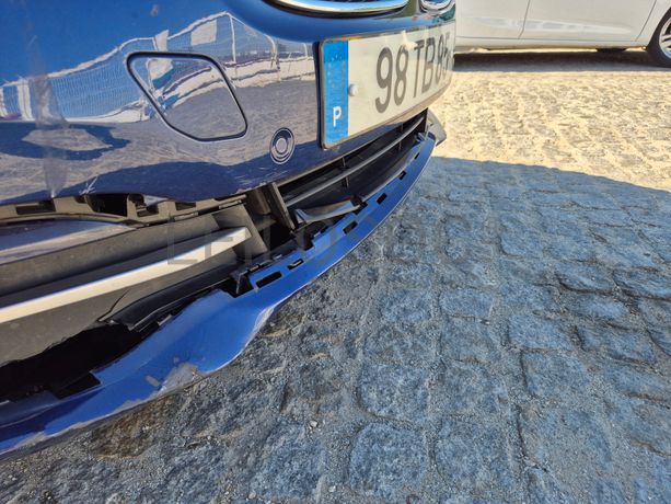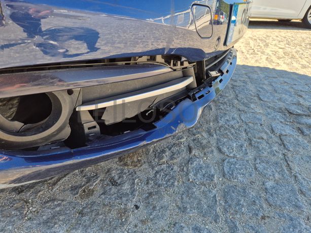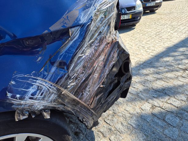 Danos visíveis: veículo acidentado, traseira do lado do condutor danificada, pintura danificada, alguns riscos e amolgadelas, avido do sistema de travagem e dos sensores de estacionamento, frente do lado do passageiro danificada, interior sujo