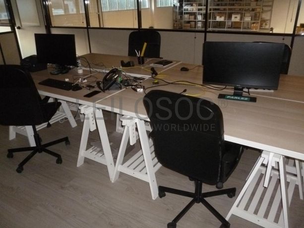 6 Mesas elevatórias, 5 cadeiras com rodas, cabide, impressora “BROTHER DCP 1610”, impressora de etiquetas “TSC”, 2 monitores TFT, 4 armários de 2 portas