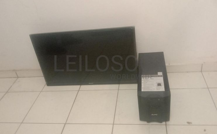 Uma TV de marca Hisense 32" e um ups de marca APC.