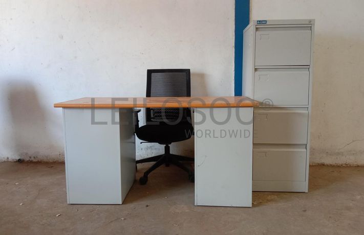 Uma secretária, um armário metálico e uma cadeira giratória.