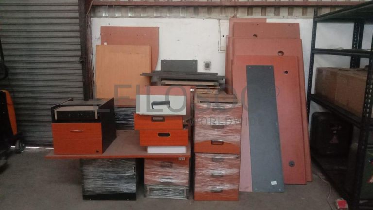 Seis secretárias desmontadas, cinco blocos rodados e um armário.