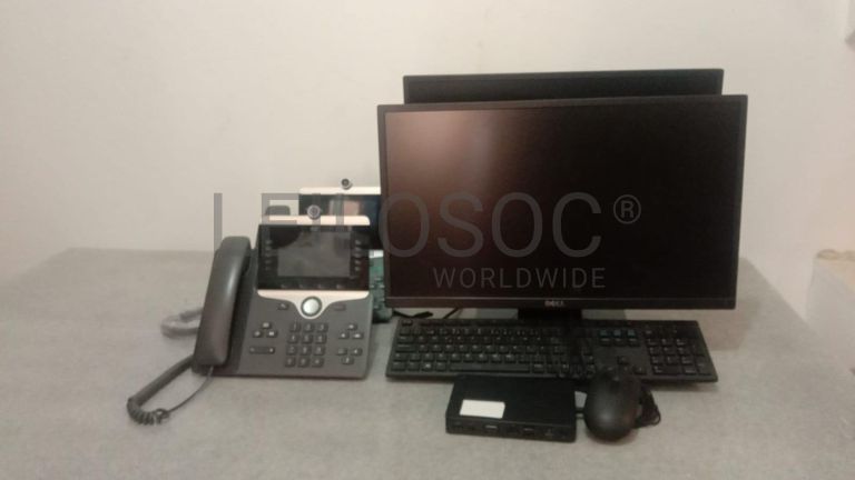Dois monitores de marca Dell, um dock station, dois telefones fixos, um teclado e um mouse.