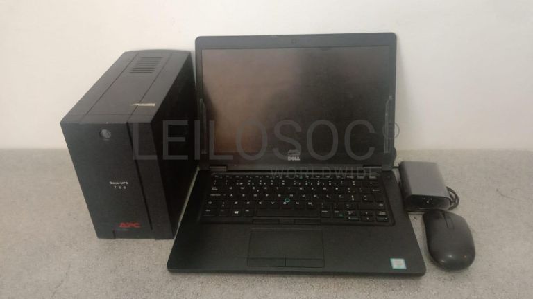 Um laptop de marca Dell Core i5, um carregador, um ups de marca APC e um mouse.