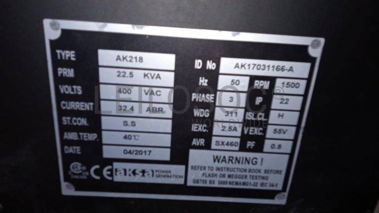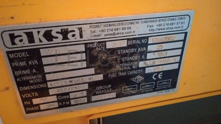 Um gerador marca AKSA , modelo APD25a, 25kva, combustível diesel