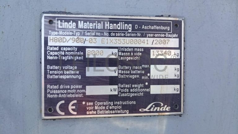Empilhador marca Linde, modelo H80D/900/03 Ano=2007, 8 tonelada, chassi E1X353U00041, com cerca de 8654h