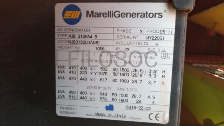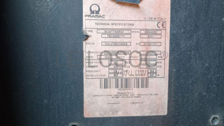 Gerador marca Pramac, modelo GSW450V Ano=2011, chassi PECS0007312 Type=SC401TWAR02