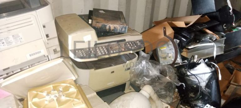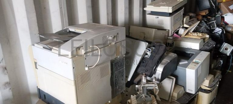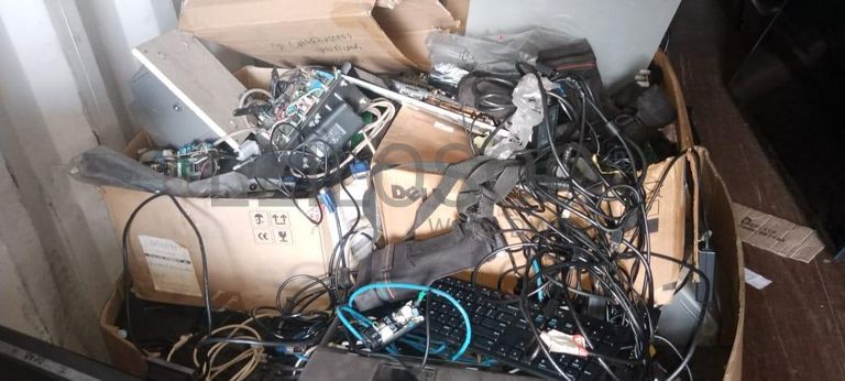 Cabos de corrente, cabos VGA, teclados da marca HP, placas, dezesseis impressoras da marca HP, cabos de rede, decoder DStv, carregador de rádio de comunicação.