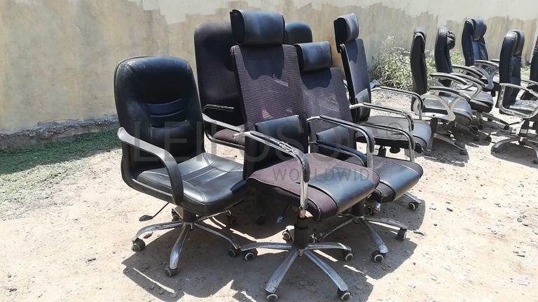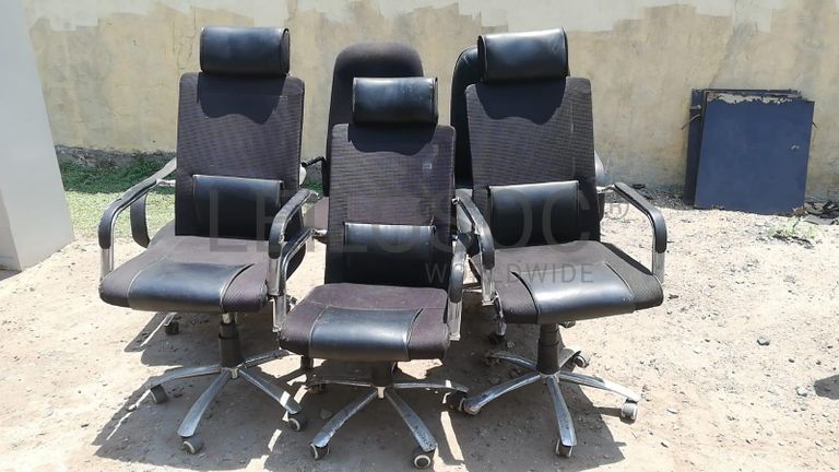Seis cadeiras de escritório giratórias.