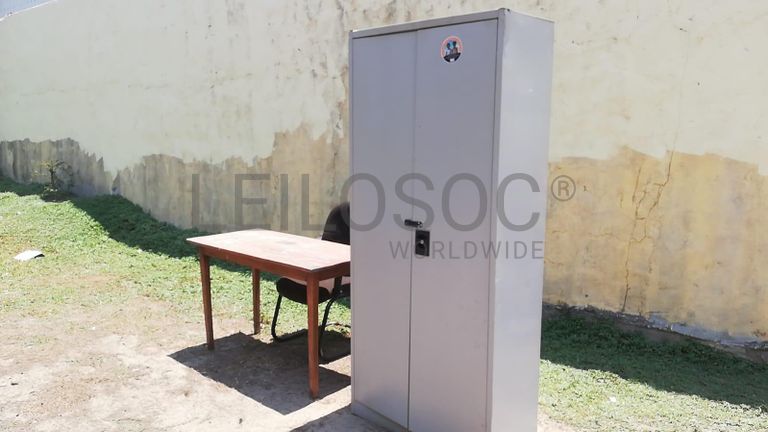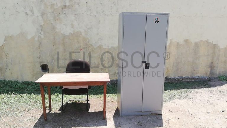 Um conjunto de cadeira, mesa de madeira e um cacifo.