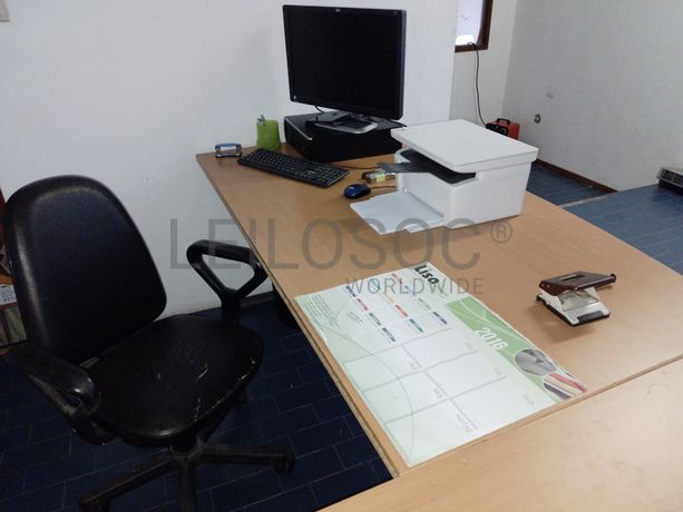 - Router "HUAWAEI", telefone portátil "VODAFONE", aparelhagem de som "WATSON", monitor "HP", impressora sem marca visível, teclado "GEMBIRD", torre "HP", secretária em L, cadeira com rodas em napa preta.