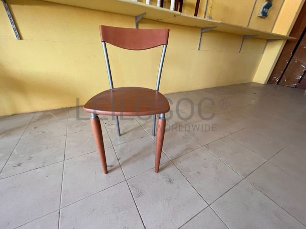 - Cadeira metálica castanha, com assento e encosto de madeira
