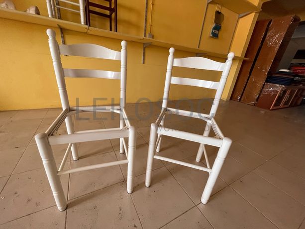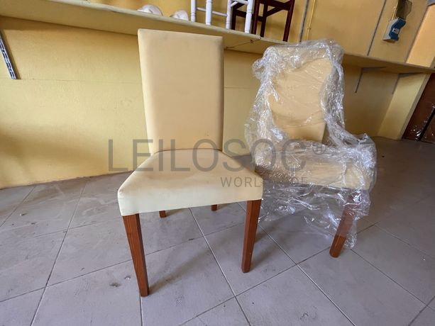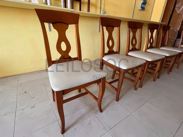 - 6 Cadeiras de madeira, com assento forrado a pele (uma com potencial para restauro)