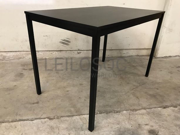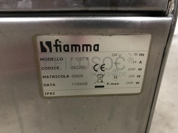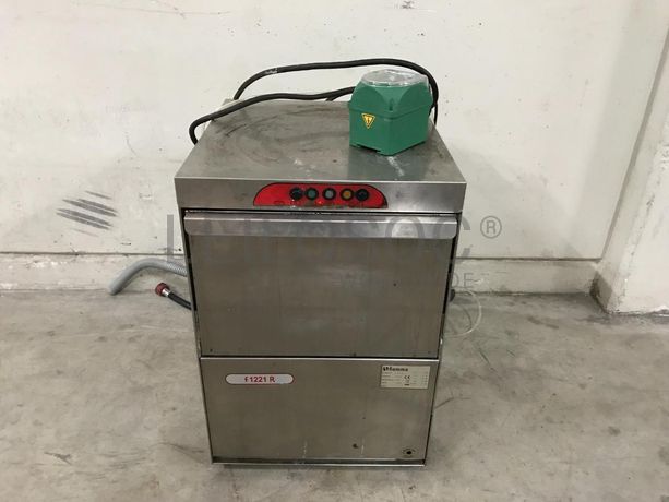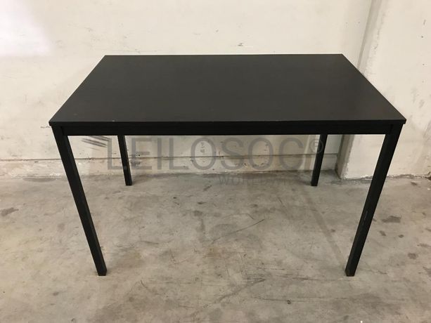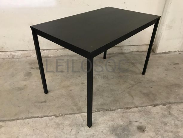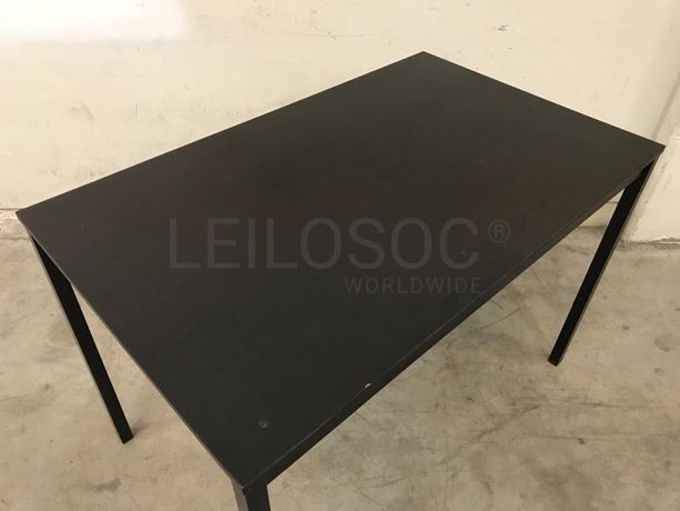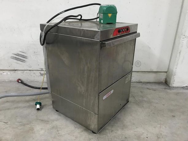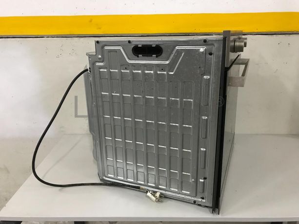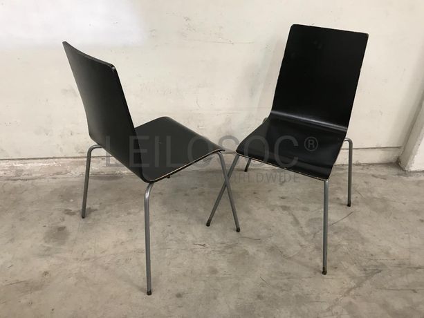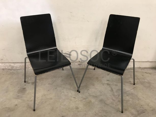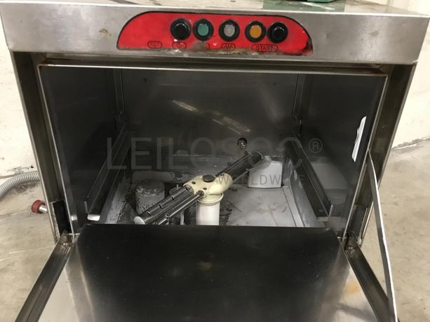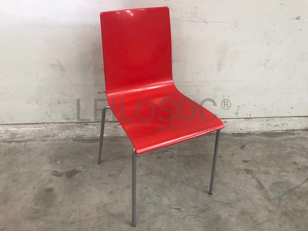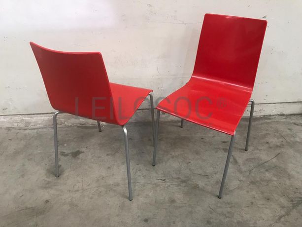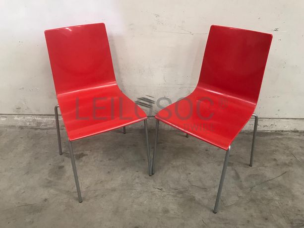 Máquina lavar louça · Forno ventilado em inox · Mesas em madeira · Cadeiras plásticas, cor vermelha · Cadeiras em madeira, cor preta.