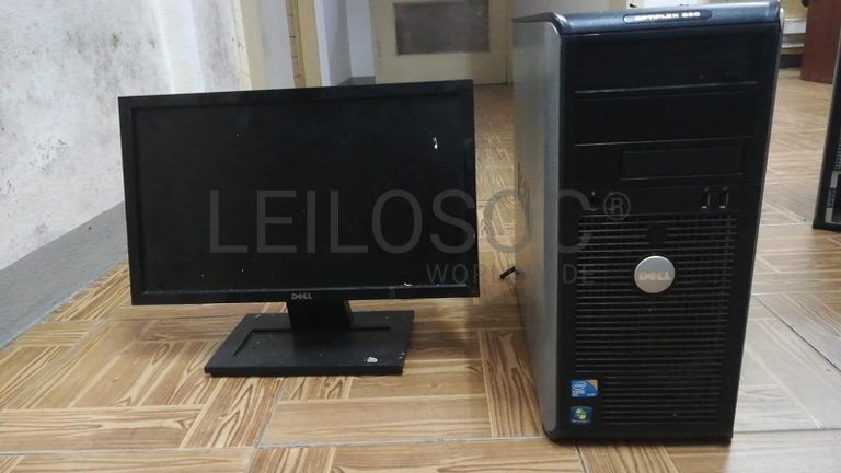 Um monitor Dell, um desktop Dell Optiplex 380 Core 2, HDD 160gb sem memória RAM e um teclado.