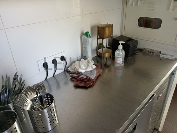 Balcão refrigerado de 3 portas, impressora de talões “EPSON”, bimby, armário superior, mesa de apoio, placa de grelhar, forno, prensa dupla, hot de 3 campos, armário de 2 portas de correr, micro-ondas “KUNFT”, robot coupé, bancada com pio e torneira, 2 prateleiras, diversos copos e utensílios de cozinha, máquina de fazer chá, garibáldi “EINHELL”, fiambreira, armário de 6 portas, escada de 2 degraus.
