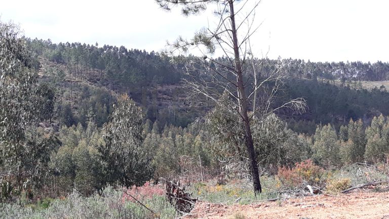 - Terreno com eucaliptos · Tem construído um pequeno casebre · Área Total de 2.830 m² · Acesso A23, N244 e Estradão do Caratão · Sito em Lugar de Oliveiras do Moinhoo · GPS: 39.585833, -7.965