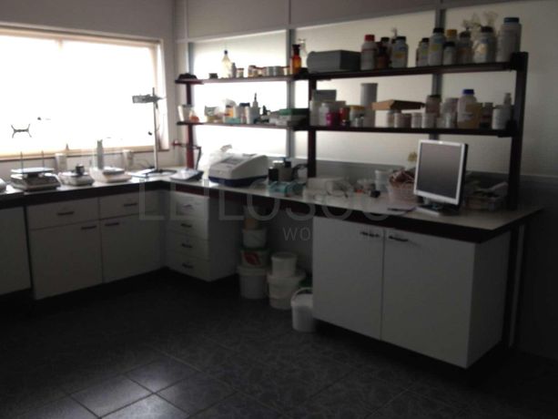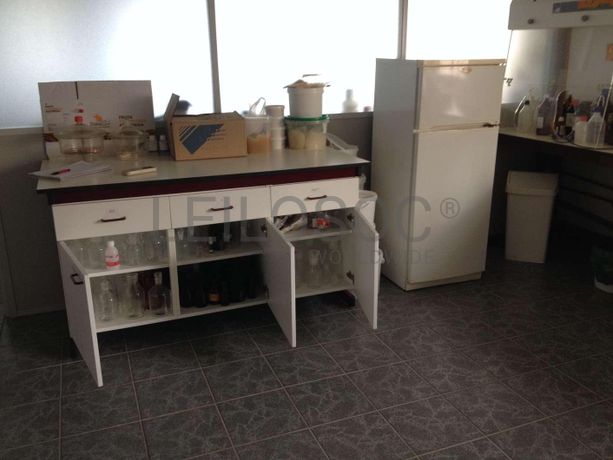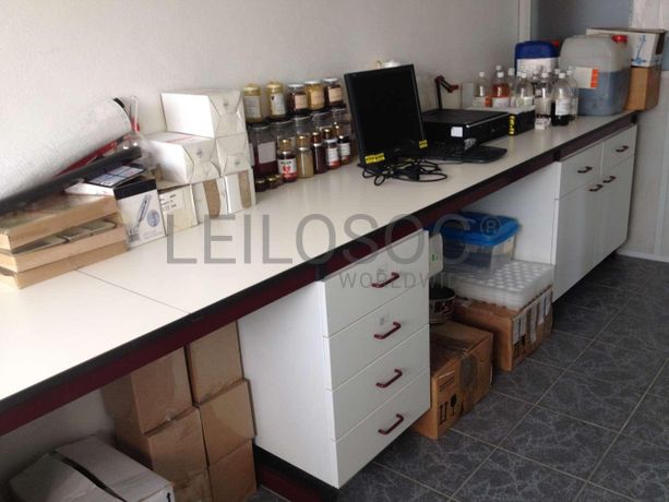 o Bancada com estrutura metálica e tampo felónico · Bancadas Metálicas · Conjunto de tubos e boiões de vidro · Estufas · Bomba de Trasfega Caldas · Torno Azul.