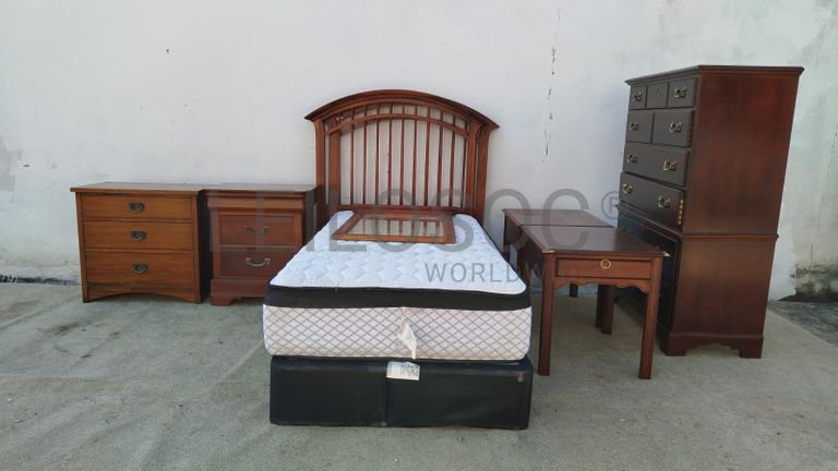 Uma cama de solteiro, uma cômoda, quatro mesinhas de cabeceira, dois encostos de cama e um espelho