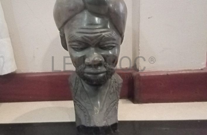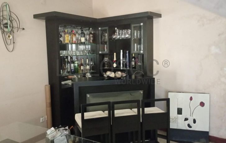 Um home bar, Um balcão, Três bancos altos, Um quadro, e uma estátua.