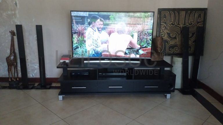 Um aparelho de som marca Samsung, composto por cinco colunas, Uma escultura, e Uma estátua de uma girrafa.