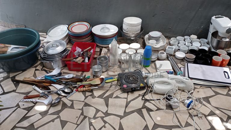 Sessenta e quatro pratos, Cinquenta e cinco copos, Catroze pirexs, Treze facas, Diversas conchas, colheres de servir, Nove tigelas de porcelana, Um rolo de massa Inox, Sessenta colheres e garfos, Vinte e duas formas de bolo, Onze pires, Dezoito chavenas de chá, Dez chavinas de café, Três batedeiras, Um liquidificador de imersão, Um termo, Seis tábuas de cortar, Dois mini fogões eléctricos de uma boca, Quatro bacias, Uma balança digital, Cinco panelas.