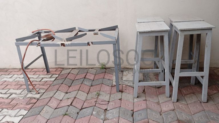 Um fogão a gás com uma boca, e quatro bancos altos.