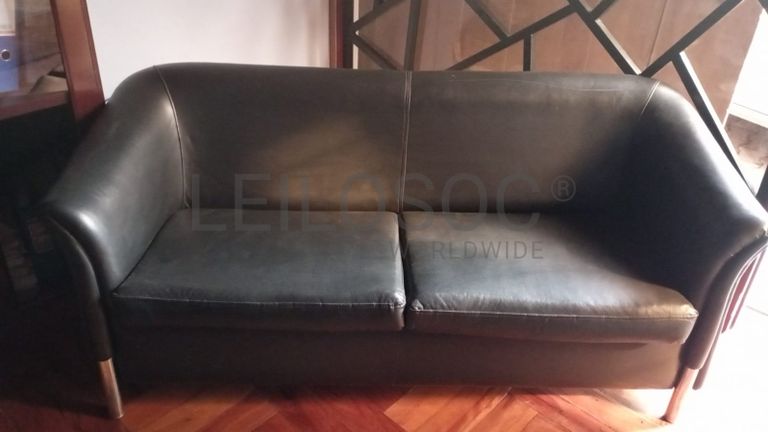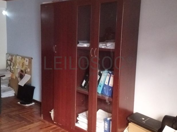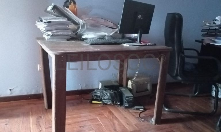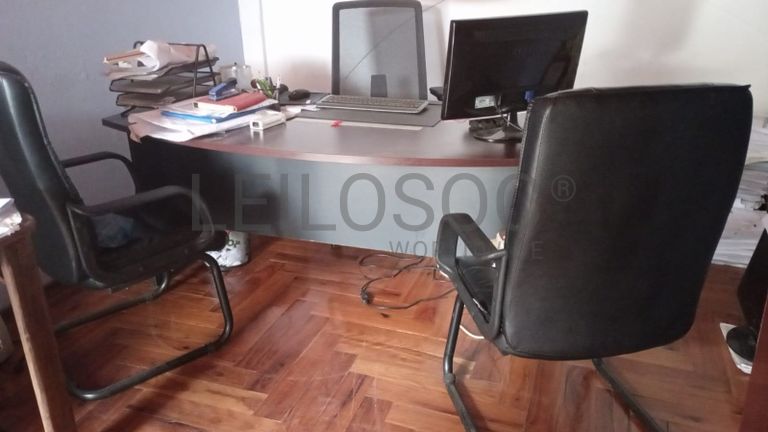 Uma secretária, Três cadeiras, sendo duas fixas, e uma giratória,