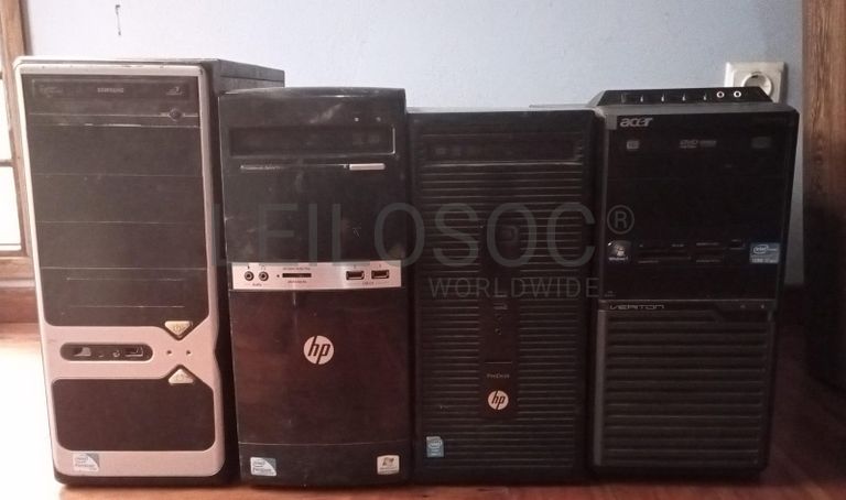 Dois teclados e dois PCs, Um bloco rodado, Um quadro dev anotações, Um sofá de dois lugares, e um armário com quatro portas, e uma mesa de apoio.