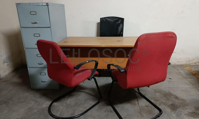 Uma secretária, um gaveteiro metálico, uma cadeira e duas fixas.