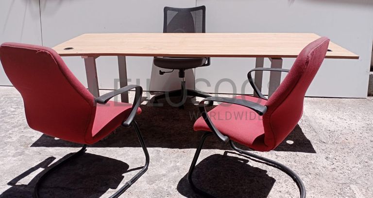 Uma secretária, uma cadeira giratória, e três fixas