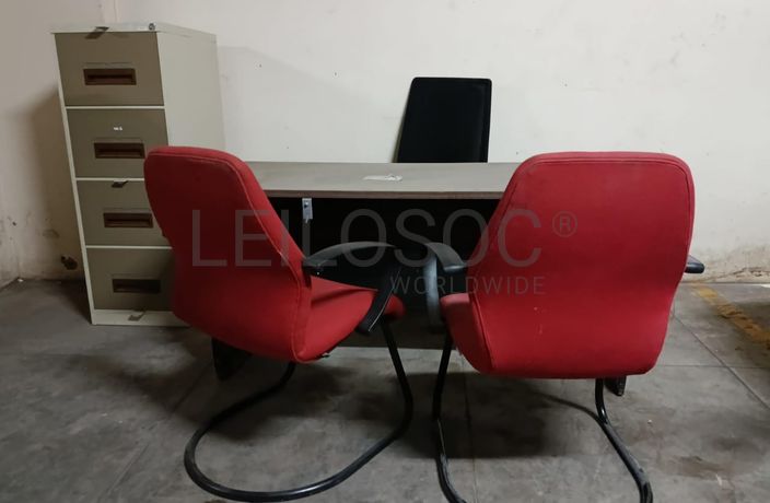 Uma secretária, uma cadeira giratória, duas fixas e um gaveteiro metálico.