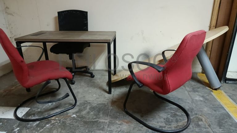 Uma secretária, uma mesa sem suporte e três cadeiras.