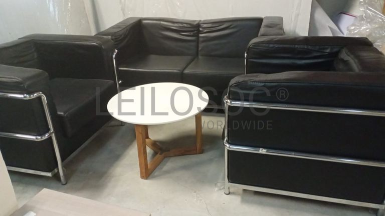Um sofá de dois lugares, dois sofás de um lugar, e uma mesinha de centro