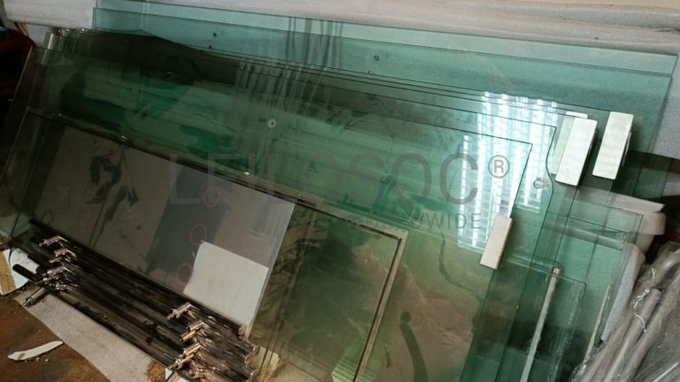 Cerca de vinte e seis portas de vidros e as respectivas pegas metálicas.