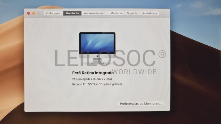 Computador Apple iMac A2116, All In One, com processador Intel Core i7, memória RAM de 16GB, disco SSD de 512GB com sistema, placa gráfica Radeon Pro 560X de 4GB, ecrã retina integrado de 21.5" e sistema