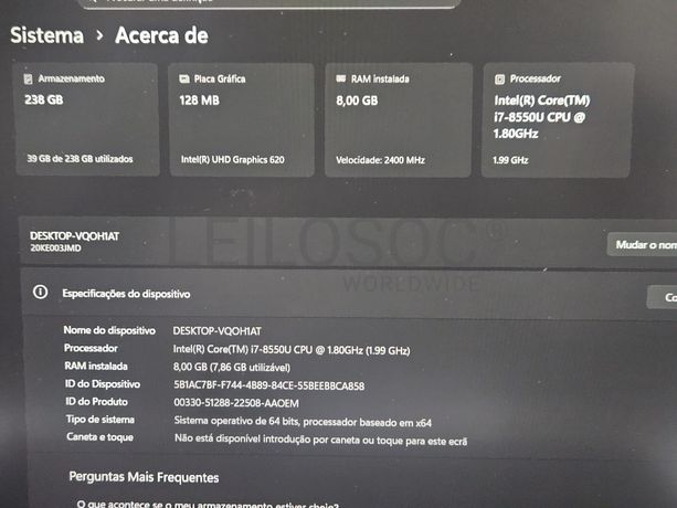 Portátil de marca Lenovo, modelo THINKPAD X280, processador intel i7-850U, com 8GB de memória RAM, disco de armazenamento de 256GB M.2. NVMe SSD, placa LTE, leitor de cartões de cidadão, com Windows 11 Pro, com carregador Lenovo original incluído. N.B.: equipamento ultrafino, ultrarrápido e ultraleve.