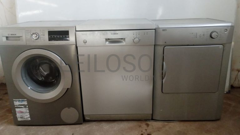 Três máquinas, uma de lavar roupa marca Bosh, uma de lavar louça marca Bosh e uma secar roupa marca Defy