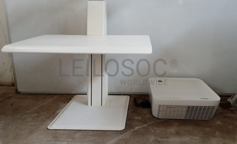 Um purificador de ar marca Solenco e um suporte para ecrã de computador
