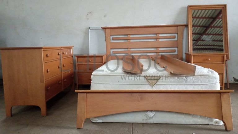Uma cama casal, duas cabeceiras e uma cómoda com espelho