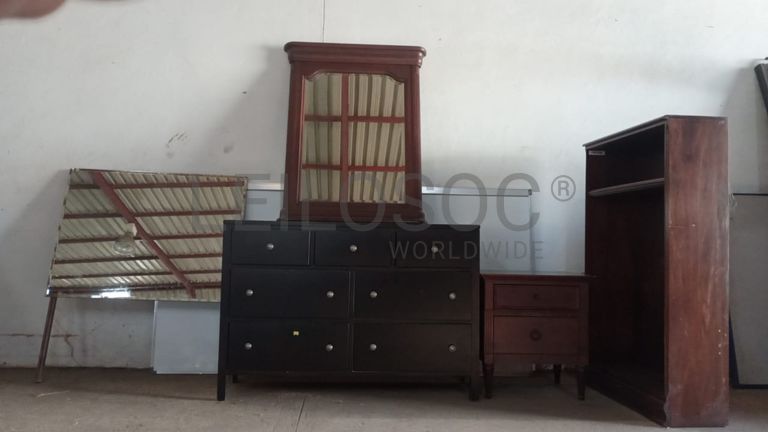 Uma cómoda, dois espelhos, uma cabeleireira e uma estante