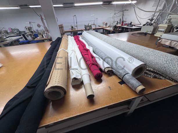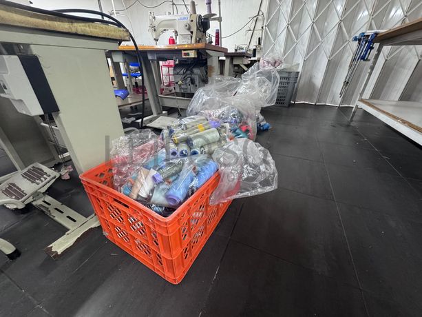- Sacos com cones de linhas e rolos de tecido.