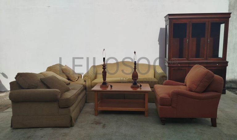 Dois sofás de três lugares, um sofá de um lugar, uma mesinha de centro, dois candeeiros e um armário