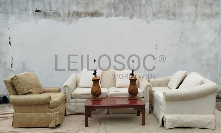Um sofá de três lugares, um sofá de dois lugares, um sofá de um lugar, uma mesinha de centro e dois candeeiros