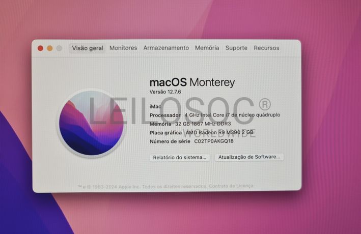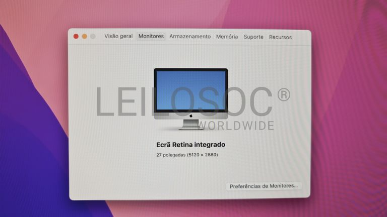 Computador Apple iMac A1419, All In One, com processador Intel Core i7, memória RAM de 32GB, disco de 500GB SSD, ecrã retina de 27" integrado e sistema operativo macOS Monterey.