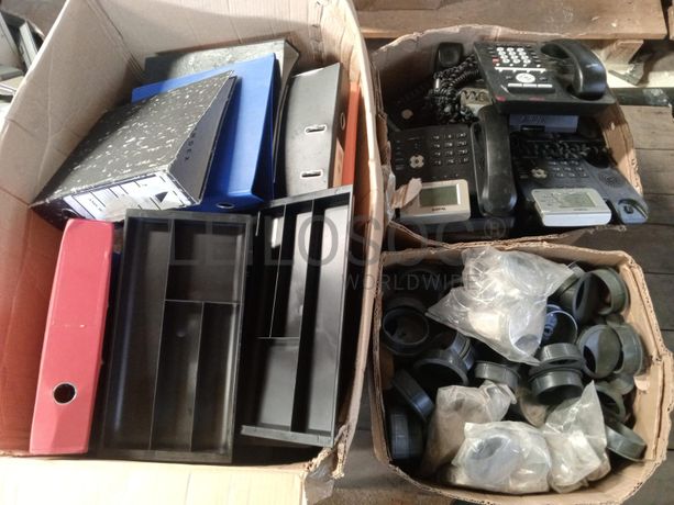 Uma caixa de tampas de secretaria, vinte divisores, trinta telefones fixos e cinquenta pastas de arquivos
