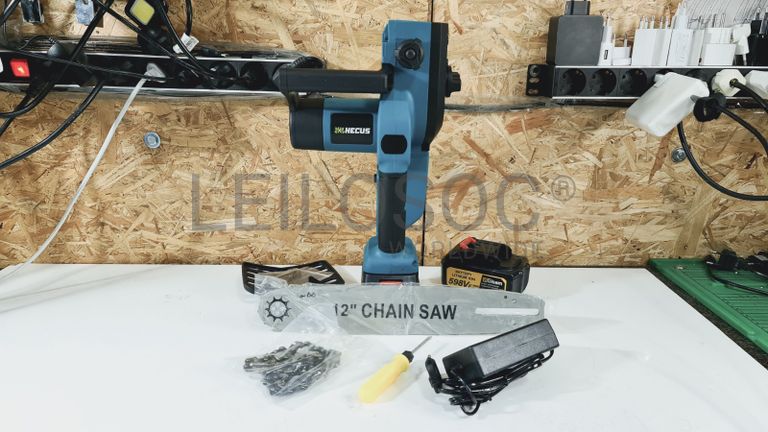 Motosserra elétrica de gama profissional, sem fios, de corpo robusto e com pega de suporte, com lâmina de 12 polegadas, com carregador e duas baterias de alta capacidade, com compatibilidade para as máquinas Makita.