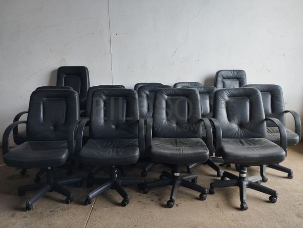 Catroze cadeiras de giratórias de escritório em couro sintético preto.