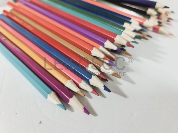 Conjunto de 72 lápis de cor, em madeira reciclada. Inclui estojo, para armazenar ou transportar os lápis.
