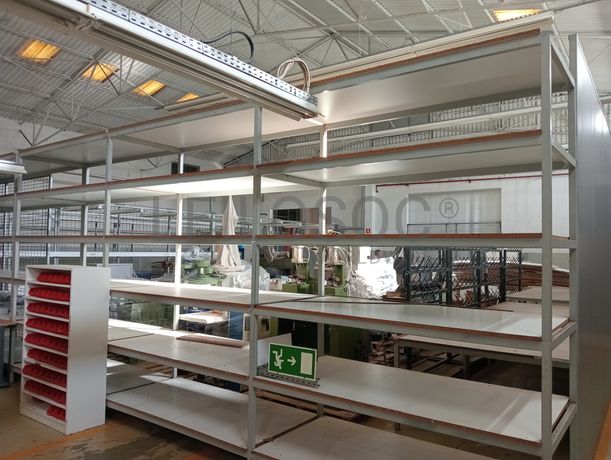Estante metálica com 3 módulos com cerca de 70 caixas plásticas