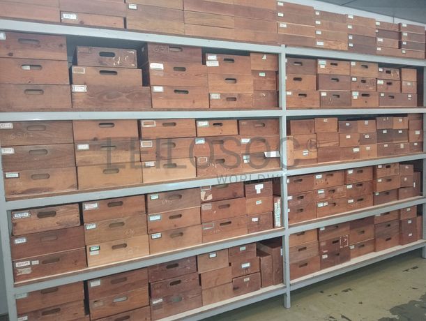 Estante com 2 módulos com cerca de 173 caixas de madeira